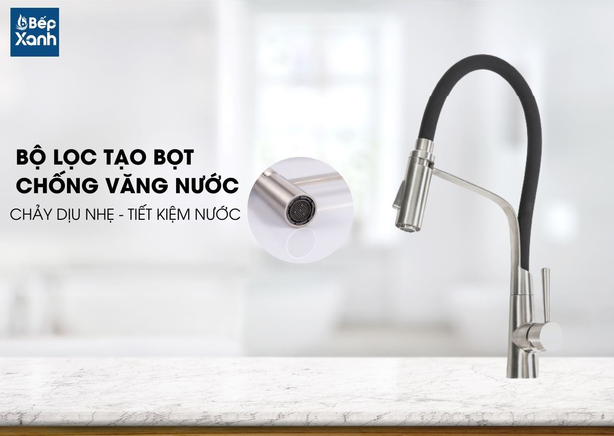 Phần đầu vòi được trang bị một bộ lọc, các hạt cát sỏi hay những cặn bẩn sẽ bị giữ lại giúp cho nguồn nước bạn lấy luôn sạch sẽ và an toàn hơn. Đặc biệt với tính năng này sẽ làm cho dòng nước chảy ra nhẹ nhàng hơn, chống văng nước.
