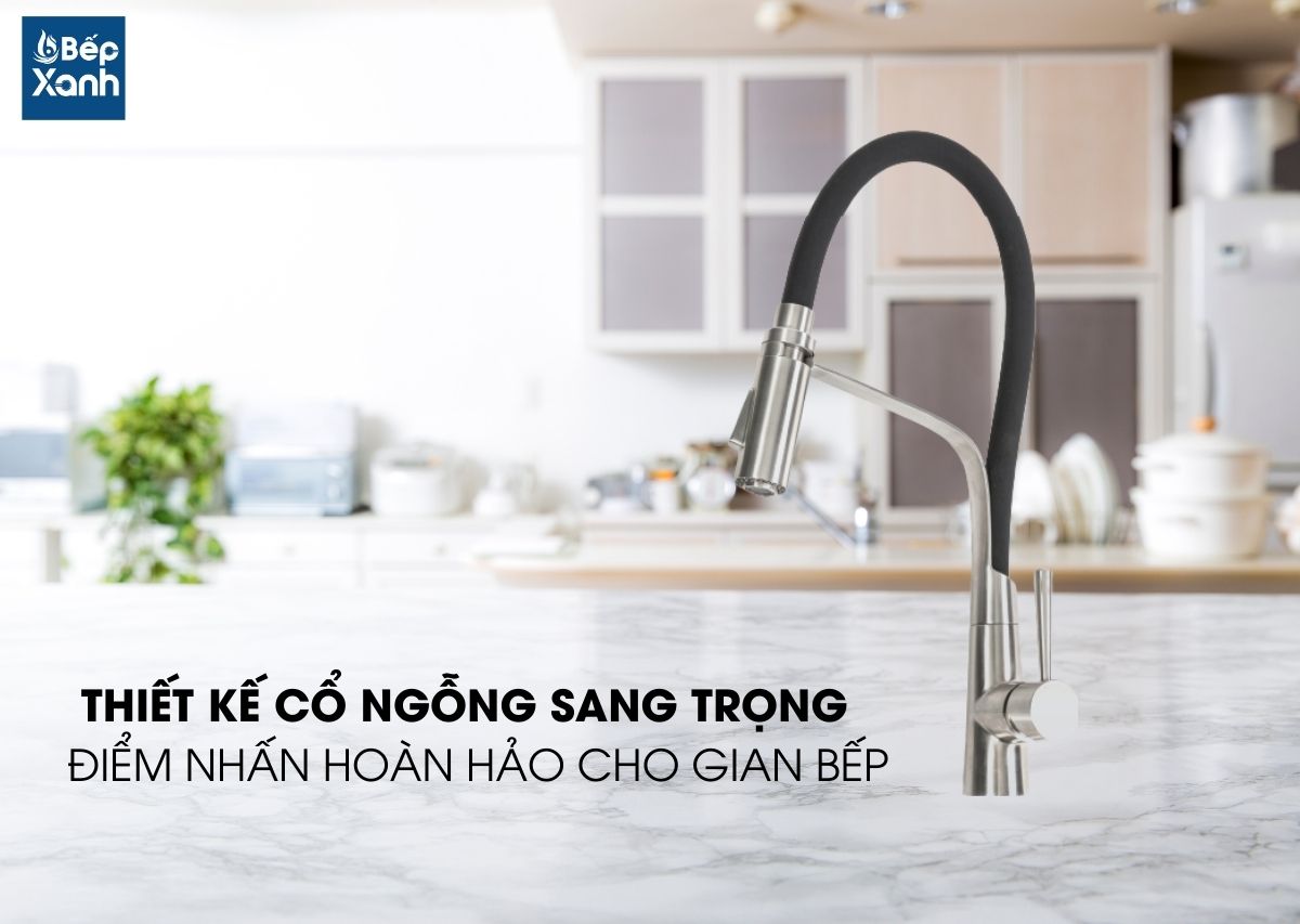 Vòi rửa Malloca K596S được thiết kế cổ ngỗng vô cùng đẹp mắt, sang trọng. Chất liệu vòi được làm bằng đồng thau mạ chrome cao cấp kết hợp với ống Silicone đen siêu bền. Đây cũng là một trong những vòi rửa chén Malloca được nhiều khách hàng lựa chọn nhất.