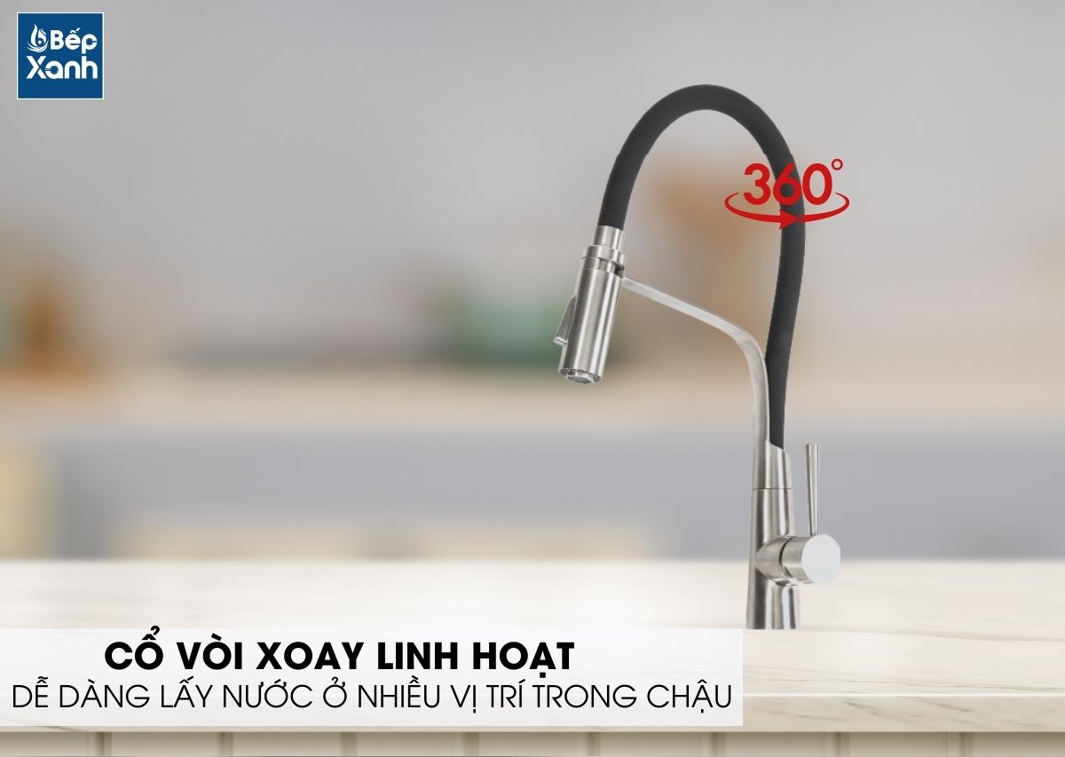 Vòi rửa chén Malloca K596S có phần cổ vòi xoay 360 độ di chuyển linh hoạt trong khắp chậu rửa thay vì được cố định như các vòi rửa thông thường, nhờ đó các vị trí xa đều có thể tiếp cận được dễ dàng. Với ưu điểm lớn này sẽ tạo được sự thoải mái và tiện lợi hơn khi sử dụng và vệ sinh.